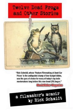 No-budget feature filmmaker Rick Schmidt has written a fascinating memoir, TWELVE DEAD FROGS AND OTHER STORIES, which, he hopes, will “fill in the blanks” on how he learned the tools of the trade and shared them in his seminal how-to, Feature Filmmaking at Used-Car Prices (Viking Penguin, 1988, 1995, 2000). Schmidt’s outside the box approach has resulted in the launch of countless moviemaking careers, for those who put his ideas into practice. Some notables include writer/director and action-star Vin Diesel (THE FAST AND FURIOUS, PITCH BLACK, GUARDIANS OF THE GALAXY), Edward Sanchez (THE BLAIR WITCH PROJECT), Tom DeCillo (LIVING IN OBLIVION), and Academy Award™ winning cinematographer Vilmos Zsigmond who declared, „I wish I could have had this book thirty-five years ago, before I made my first low-budget features.” Writer/Director Kevin Smith (CLERKS, CHASING AMY), in his online speech for Schmidt’s Lifetime Achievement Award, bestowed at Rome international film Festival, helps to explain the book’s appeal: https://vimeo.com/161243386. But Schmidt’s path to filmmaking was anything but smooth or easy. After his first marriage fails, his artworks, like the large cast aluminum and painted kinetic piece entitled, “I Can’t Get it Up For You,“ reflected his personal life and kick-started a narrative that continued into moviemaking. His transition to filmmaking occurred in 1970 when California author (“Ghosts”) and videographer Phillip Makanna, invited him, along with Schmidt’s future roommate/collaborator Wayne Wang (JOY LUCK CLUB), writer/director William Farley (OF MEN AND ANGELS), actor/producer Willie Boy Walker (THE FIFTH WALL). others, to take his video class. Using the new Sony Porta-Pac video camera, Schmidt did work that gained attention. Don’t miss chapters on Schmidt’s eight-day cross-country hitchhike trip, Joe’s Sandwiches, or his struggle to produce SHOWBOAT 1988-THE REMAKE. Ironies abound, in this touching and informative indie page-turner.