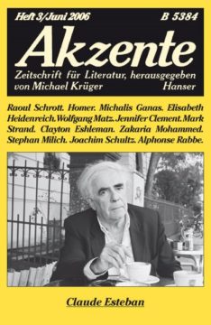Raoul Schrott: Sieben Prämissen einer neuen Übersetzung der Ilias · Homer / Raoul Schrott: Ilias. Erster Gesang · Michalis Ganas: Verborgenes Basilikum verströmt sich · Elisabeth Heidenreich: Gedichte · Claude Esteban: Auf der letzten Heide. Gedichte · Wolfgang Matz: Claude Esteban 1935-2006 · Mark Strand: Das Ende. Gedichte · Jennifer Clement: Dieser Augenblick nur. Gedichte · Clayton Eshleman: Mein Körper als Korb von unbestimmter Größe. Die Autobiographie Unica Zürns · Zakaria Mohammed: Gedichte · Stephan Milich: Interview mit Zakaria Mohammed · Alphonse Rabbe: Album eines Pessimisten. Fünf Prosagedichte · Joachim Schultz: Ein Moralist des Todes. Anmerkungen zu Alphonse Rabbe