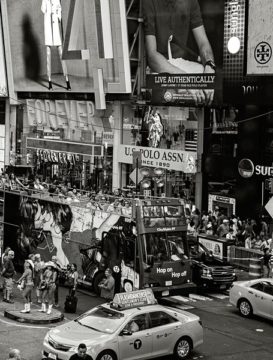 In America’s Stage: Times Square, street photographer Betsy Karel uses five New York City blocks as a metaphor for urban America today. Her premise is that many of the major trends of our society are present in Times Square: globalism, consumerism, ubiquitous sexualization, hucksterism, surveillance, narcissism. All are compressed and amplified here. In Karel’s photos fantasy parades as reality, corporate interests invade almost all public spaces, and Times Square becomes a vivid, almost hyper-realistic, form of theatre.