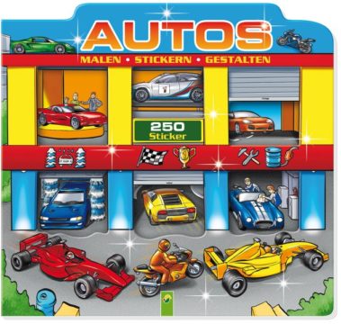 Welcher Wagen steht neben dem Jeep im Parkhaus? Welches Auto hat der Abschleppwagen zur Werkstatt gebracht? Und welches Fahrzeug hilft dem Bagger auf der Baustelle? Klebe die Sticker auf die bunten Seiten und gestalte deine eigene Autowelt!