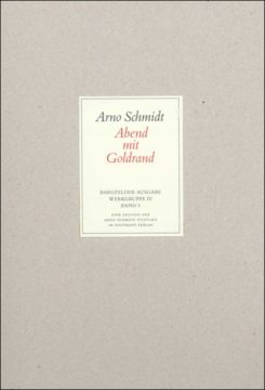 Wie Die Schule der Atheisten ist auch der 1975 veröffentlichte Abend mit Goldrand ein Dialogroman, doch entführt die MärchenPosse – so die Genrebezeichnung – mit ihren 55 Bildern den Leser nicht in eine phantastische Zukunft, sondern in die Gegenwart des fiktiven Heidenests Klappendorf im Jahr 1974. Drei alte Männer, alle-samt Abschattungen ihres Schöpfers Arno Schmidt, beherrschen die Szenerie: der Militärexperte Eugen Fohrbach, der Bibliothekar Egon Olmers und der Schriftsteller Alexander Ottokar Gläser, genannt A&O. Den drei literaturversessenen Rentiers zur Seite stehen Fohrbachs Frau Grete, beider Stieftochter Martina und die Haushälterin Asta Reichelt. Das Geschehen gerät in Bewegung mit der Ankunft einer Gruppe von Hippies, die auf dem Weg nach Tasmanien drei Tage in dem Dörfchen ihr Lager aufschlägt. Deren geisterhafte Anführerin Ann‘ Ev‘ und der intellektuelle Kopf der Truppe, »Egg«, durchkreuzen die Gespräche der drei Alten über Friedrich Hackländer, Theodor Däubler und all die andern Unbekannten der Literatur und wirbeln sämtliche Beziehungen durcheinander. Der melancholische Roman, der von Erinnerungen an Schmidts eigene trostlose Kindheit durchzogen ist, sollte das letzte Werk werden, das er vollenden konnte.