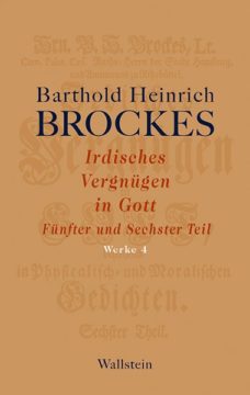 Zutreffender kann man es nicht sagen: ‚Ihm war des Schöpfers Welt ein Schauplatz seiner Güte.‘ So Nikolaus Dietrich Gieseke zu Brockes` Naturverständnis. Die Herzen der Leser zu rühren, ist Brockes` Endzweck, dem alles dient – der Wohlklang der Poesie und ihre Vielfalt: Moralische, Natur- und Sinngedichte, Anschauliches oder Gedankliches, Lehrhaftes, ständiger Wechsel der Themen und Betrachtungsweisen, die rhetorischen Figuren der schmückenden Rede. Beispielhaft für solche Virtuosität sind die Verse der ‚Wasser-Rede‘ im nunmehr vorliegenden fünften Teil des Irdischen Vergnügens in Gott, dessen ‚Abschied vom Garten‘ als letztes Sommergedicht bereits an Brockes` bevorstehende Übersiedlung nach Ritzebüttel 1735 denken läßt. Wie die vorigen Teile, so gliedert sich auch der fünfte und der ihm folgende in Ritzebüttel entstandene sechste Teil des Irdischen Vergnügens nach den Jahreszeiten. Doch Jahreszeiten-Gedichte beanspruchen hier nicht mal ein Drittel des Umfangs. Der größere Anteil kommt den vermischten Gedichten zu, und unter ihnen den 37 Gedichten zu Kupferstichen nach Johann Elias Ridingers Betrachtung der wilden Thiere.