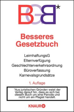 Nach 111 Jahren und 66 Auflagen schickt Bestsellerautor Oliver Kuhn das Bürgerliche Gesetzbuch in den längst verdienten Ruhestand. Verstanden hat es eh keiner mehr, und spaßig war es nie. Es wird ersetzt durch das Bessere Gesetzbuch, in dem so zentrale Rechtsbereiche wie die Beziehungsgesetze, das Bestäubungsmittelgesetz, die Gaststättenunordnung und das Uhrheberrecht neu und überzeugend geregelt werden. Ein schlüssiges Beispiel aus den Büro-Gesetzen: »§4 Die Entscheidungsträger einer Firma sind hierarchisch geordnet und unterliegen folgender Reihenfolge: 1. Chef; 2. Stellvertreter des Chefs; 3. Büroleiter; 4. Menschenverstand, gesunder«.