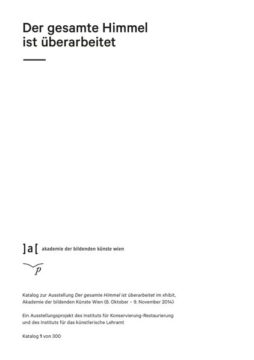 Katalog zur Ausstellung „Der gesamte Himmel ist überarbeitet“ im xhibit, Akademie der bildenden Künste Wien (8. Oktober – 9. November 2014). In der Praxis und Forschung der Restaurierung und Konservierung entstehen Objekte, die über ihre ursprüngliche Funktion als Testobjekt oder Hilfsmittel hinaus eine eigene Ästhetik entwickeln können. Der gesamte Himmel ist überarbeitet zeigt diese Zwischen-, Neben- und Abfallprodukte als eigenständige Artefakte und untersucht ihre komplexe Beziehung zu künstlerischen Ästhetiken und restauratorischen Prozessen. Die Ausstellung ermöglicht neue Sichtweisen auf restauratorische und konservatorische Praktiken, indem sie das restaurierte resp. das „verstandene“ / „erschlossene“ Kunstwerk aus dem Brennpunkt der Aufmerksamkeit entfernt und statt dessen die im Prozess entstandenen Artefakte ins Zentrum stellt.
