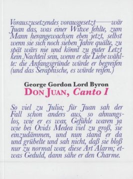 Dieses Booklet mit dem ersten Canto von Lord Byrons DON JUAN führt zurück in die englische Romantik. Günter Plessow, Berlin, ist es gelungen, den Zeitgeist von damals passend in die heutige Zeit zu übermitteln – wobei er es sich nicht nehmen liess, den Spirit des Dichters mit eigenem Witz zu aktualisieren. Dennoch blieb er nahe am Original.