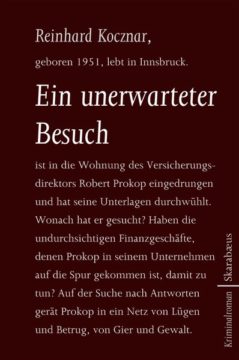 Ein unerwarteter Besuch ist in die Wohnung des Versicherungsdirektors Robert Prokop eingedrungen und hat seine Unterlagen durchwühlt. Wonach hat er gesucht? Haben die undurchsichtigen Finanzgeschäfte, denen Prokop in seinem Unternehmen auf die Spur gekommen ist, damit zu tun? Auf der Suche nach Antworten gerät Prokop in ein Netz von Lügen und Betrug, von Gier und Gewalt. Reinhard Kocznar gelingt in seinem Romanerstling ein packender Versicherungskrimi, der tief in ein verschlungenes Netz von Lügen und Betrug, von rücksichtsloser Gier und skrupelloser Gewalt führt.