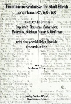 Der Autor Andreas Friese transkribierte aus drei Adressbücher des Kreises Nordhausen, die Einwohner für die Stadt Ellrich nebst deren dazugehörigen Gemeinden. Das Adressbuch von 1927 ist dabei ein nur selten existierendes Einwohnerbuch.