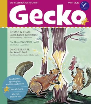 Im Gecko-Osternest liegen wieder jede Menge bunte, lustige und nachdenkliche Geschichten, Gedichte und Mitmachseiten. Bei den Freunden Kosmo und Klax geht es um einen falschen Verdacht, Hexe Zwickurlaub hat einen gar
