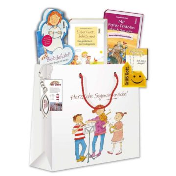In dieser schönen Geschenktasche, die durch ihr schlichtes und doch fröhliches Design besticht, finden Sie fünf Sachen, mit denen frisch gebackene Schulkinder viel Spaß haben können. Dazu gehören das Kindergebetbuch »Lieber Gott, behüte uns«, das Geschenkbuch »Bleib behütet!«, das durch seine Engelsform begeistert und das Buch »Mit Pater Fridolin durch das Jahr«, in dem zahlreiche humorvolle Kindergeschichten zu lesen sind. Hinzu kommen noch ein Reflektor-Anhänger, der durch seine moderne und freundliche Aufmachung erfreut und gleichzeitig die Sicherheit des Kindes gewährleisten kann, sowie ein Schlüsselanhänger in Form eines Fisches.