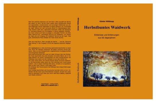 Nach der positiven Resonanz auf sein Buch „Wem sprudelt der Becher des Lebens so reich“ hat der Autor wieder einen herbstbunten Strauß von spannenden, wissenswerten und humorigen Erlebnissen aus seinem 60jährigen reichen Jägerleben zu Papier gebracht. Als „Frontsoldat der Jagd“ lieferte ihm sein vertrautes Revier im Weserbergland abermals reichlich Stoff dazu. Besondere Farbtupfer bilden die Abenteuer im Traumland Kanada und Pirschjagden in seinem geliebten Namibia. Der Autor scheut auch keine Aussagen zu aktuellen Themen wie Wolf, Biber, Seehund etc., nachhaltige Nutzung von Wildtieren, zum Wesen der Jagd und zum Umgang mit moderner Technik bei der Jagd. Viele gute, authentische Fotos beleben die Texte dieses Buches. Über das erste Buch „Wem sprudelt der Becher…“ hat die „Deutsche Jagd Zeitung“ in Ausgabe 1/2018 die folgende Rezension abgegeben: „Ein Jagdbuch, in dem durchweg spannende Geschichten zu lesen sind. Nicht die üblichen Erlebnisse, die jedem Grünrock einmal passieren. Nein, es sind Missgeschicke, ungewöhnliche Hundegeschichten und einzigartige Abenteuer. Nicht bloß einmal läuft dem Leser ein kalter Schauer über den Rücken. Der Autor beschreibt etwa eine Situation mit einem Bären, der in Kanada plötzlich mit seinen Vorderbranten auf dem Fensterrahmen von Wittkopps Auto stand und den Verfasser so aus dem Schlaf riss. Der Leser merkt sofort, mit welcher Passion dieser Grünrock weidwerkte.Die Geschichten reißen einen mit. Den Abschied vom „Hund seines Lebens“, wie er seinen Drahthaar Bill nennt, schreibt er so ergreifend, dass es dem Leser Tränen in die Augen treibt. Als Anhänger des Totverweisens hat Wittkopp über einige Erfahrungen zu berichten. Auch witzige Geschichten und Ausrutscher kommen nicht zu kurz. Außerdem hat der Autor auch Informationen verpackt. So kann der Leser, wenn er gemütlich am Ofen sitzt und in seinem Buch blättert, nebenbei noch Neues erfahren.“