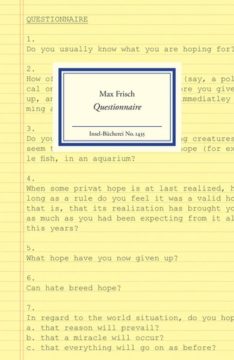 »Halten Sie sich für einen guten Freund? Sind Sie sich selber ein Freund?« Zwischen diesen beiden Fragestellungen liegen 23 Fragen zum Thema Freundschaft. Max Frischs berühmte Fragebogen entstammen dem Tagebuch 1966-1971, und jeder dieser zehn Fragebogen kreist ein Thema ein: Es geht um Ehe, Frauen, Humor, Geld, Freundschaft, Vatersein, Heimat, Eigentum und nichts weniger als die Erhaltung des Menschengeschlechts. Die Antworten bleiben der Fantasie der Leser überlassen – ein unwiderstehlicher Lesegenuss.
