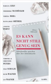 Ihr Arbeitsplatz sei wie ein Raumschiff, sagt Veronika Peters. Man könne überall sein und bleibe doch am selben Ort. Friederike Mayröcker schreibt nur in ihrer eigenen Wohnung. Das, was einmal ihr Schreibtisch war, hat sie so mit Papierstapeln überhäuft, dass daraus ein »Nicht-Schreibtisch« geworden ist. Hanns-Josef Ortheil saugt täglich mit einem Handstaubsauger etwa dreißig Sekunden den Boden unter seinem Glastisch, aber auf der Platte selbst schätzt er Schweiß- oder Schmutzabdrücke – als natürliche Spuren seiner Arbeit.