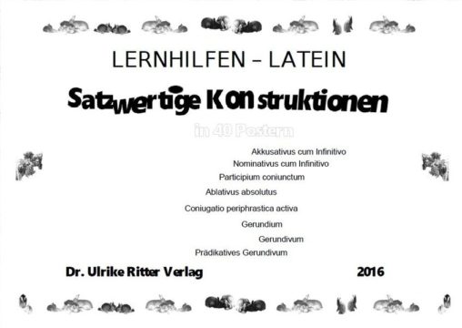 40 Seiten mit übersichtlichen stichwortartigen Erklärungen aller satzwertigen Konstruktionen des Lateinischen: AcI, NcI, Abl.Abs. und Partizipien allg., Sonderformen des Partizip Futur aktiv, Gerundium, Gerundivum. Begleitend zum Lateinunterricht als grammatische Lernhilfe und Verständnishilfe für Latein ab jeder Klassenstufe (Latein 1,2,3). Mit Beispielsätzen in Latein und Deutsch. Auch als Folienvorlage für Referate oder den Unterricht geeignet. Gestaltung jugendlich und markenspezifisch (Tiermotive, freches Design, an Schülerheften orientierte, individuelle Umschlaggestaltung, Farbgebung variiert). Themenspezifisch werden einzelne Seiten zum Kennenlernen des Buches auf der Internetseite des Verlags vorgestellt: www.dr-ulrike-ritter-verlag.de