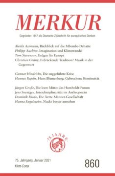 Im Aufmacher lässt Aleida Assmann noch einmal die um einen geplanten Auftritt Achille Mbembes aufgebrochene Debatte um das Verhältnis von Postkolonialismus und Antisemitismus Revue passie-ren. Philipp Auchter glaubt nicht, dass die von manchen beschworene Vorstellungskraft uns im An-gesicht des Klimawandels retten wird – ganz im Gegenteil: Es gelte, gerade sie einer solchen Funk-tionalisierung zu entwinden. Tom Stevenson hält das Festhalten Deutschlands an der direkten Erd-gas-Pipeline Nord Stream 2 für nicht problematisch und warnt davor, Russlands Kraft zu überschät-zen. Christian Grüny unterzieht das Feld der klassischen (und der Neuen) Musik einer sehr kriti-schen Sichtung.