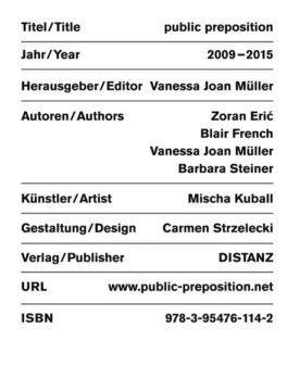 Mit public preposition realisiert Mischa Kuball (geb. 1959 in Düsseldorf, lebt und arbeitet in Düsseldorf) seit 2009 eine Serie von Installationen im öffentlichen Raum. Die Frage nach der zeitgemäßen Definition dieser Kunst- form bewegt Künstler seit den 1970ern; die Antworten haben sich in dieser Zeit wesentlich verändert. Kuballs Projektreihe positioniert dieses Thema neu. Texte von Barbara Steiner, Blair French, Zoran Eric u. a.