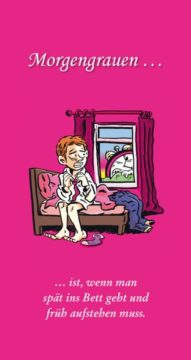 Morgengrauen… ist, wenn man spät ins Bett geht und früh aufstehen muss. von Klaus F Otto Lustige Definitionen und Wortspiele Veröffentlicht am Mittwoch 3. Dezember 2014 von Knapp, FritzISBN: 978383140862732 SeitenGenre: Belletristik, Cartoon, Cartoons, Comic, Humor, Satire Teile dieses Buch auf: twitter facebook