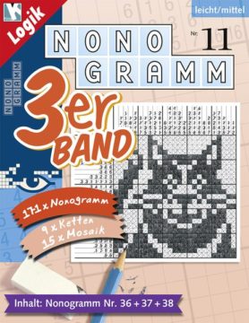 Im Nonogramm 3er-Band Nr. 11 sind drei Ausgaben des Magazins Nonogramm aus dem Küng Verlag zusammen gebunden. Insgesamt umfasst der 3er-Band über 170 Nonogramm-Rätsel in schwarzweiss, aber auch Ketten-Rätsel (Hashi) und Mosaik-Rätsel. Nonogramm ist auch bekannt als Pic-a-pix, Hanjie oder O Ekaki. Nonogramm bietet mehr als übliche Rätsel: Sie sind auch kleine Kunstwerke. Dies, weil mit jedem gelösten Rätsel auch ein Bild entsteht. Sie werden beim Lösen zum Zeichner. Die Zahlen um das Rätselgitter geben an, wo die Flächen liegen, die auszumalen sind. Das ist leicht erklärt, kann aber recht anspruchsvoll sein. Im Nonogramm 3er-Band Nr. 11 sind die bereits erschienenen Nonogramm-Hefte Nr. 36, 37 und 38.