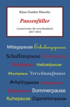 Diese Zeit gilt es zu überbrücken, möglichst entspannend und erholsam. Bestens geeignet hierfür ist das Buch Pausenfüller. Die kurzweiligen Texte in Prosa und Lyrik zu ganz alltäglichen Themen lassen keine Langeweile aufkommen. Sie bringen uns abwechselnd zum Schmunzeln und zu herzhaftem Lachen oder regen zum Nachdenken an.