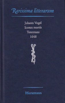 Band 7 der Reihe „Rarissima litterarum. Nachdrucke seltener Originalwerke aus dem 16. bis 18. Jahrhundert“ (siehe auch unter: X-8152-5100-7), herausgegeben von Professor Dr. Gerhard Dünnhaupt, Toronto, ist der Totentanz „Icones mortis“ des Johann Vogel, Nürnberg 1648. Das Buch ist die nach dreihundertfünfzig Jahren erstmals reproduzierte zweisprachige Version aus dem Jahre des Westfälischen Friedens (1648) und geht zurück auf die neulateinische Versdichtung „Icones mortis“, Basel 1554, des Georg Aemilius (Oemler) sowie die deutschsprachige Dichtung „Der Todten Dantz“ des Caspar Scheidt von 1557. Vom Original dieses Faksimiles sind weltweit nur vier Exemplare bekannt. Die 60 gezählten Kupfer, im wesentlichen unveränderte Sujets des berühmten Baseler Totentanzfreskos Hans Holbeins d.J., von dessen Original heute nur noch Spuren erkennbar sind, sowie drei weitere ungezählte wurden speziell für diese Ausgabe vom Nürnberger Stecher Eberhard Kieser neu gestochen. Für die Forschung von zusätzlichem Interesse sind die „neuen Teutschen Verßlein“ des bedeutenden Barockdichters Georg Philipp Harsdörffer, der die von ihm verfassten neunzehn Seiten deutscher und lateinischer Verse mit seinen Initialen „G.P.H.“ signierte. 1998. 167 Seiten mit 63 Kupfern. ISBN 3-7772-9822-0. Leinen DM 198,-