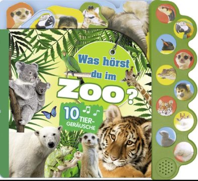 In diesem ganz besonderen Soundbuch werden die beliebtesten Zootiere mit ihren Lauten vorgestellt. Einfach auf die Knöpfe mit den Tiergesichtern drücken und schon hörst du das entsprechende Geräusch. Dazu gibt es noch jede Menge interessante Infos über die verschiedensten Tiere und ihre Gewohnheiten. Man erfährt beispielsweise wofür Pinguine ihre Flügel benutzen, wie Erdmännchen zusammenleben oder was Babyaffen machen.