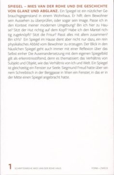 In einer neu aufgelegten Schriftenreihe des Mies van der Rohe Hauses erscheint als erster Band eine bildliche und textliche Auseinandersetzung zum Thema „Mies van der Rohe und der Spiegel“. Einerseits setzen sich Texte ganz konkret mit dem Spiegel und seiner Bedeutung im Landhaus Lemke auseinander, andere Beiträge wiederum öffnen den Blick auf Spiegel und Spiegelungen in Mies van der Rohes Gesamtwerk. Der Blick auf den Spiegel – und hinter ihn – wird erweitert mit Texten zur philosophischen Reflexion und ästhetischer Annäherungen an den Spiegel.