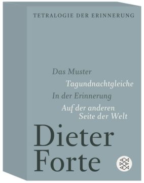 Mit seinen hochgerühmten Romanen »Das Muster«, »Tagundnachtgleiche« (ursprünglich »Der Junge mit den blutigen Schuhen«), »In der Erinnerung« und »Auf der anderen Seite der Welt« erzählt Dieter Forte die Geschichte zweier Familien, die im Schicksal eines Jungen in den 50er Jahren des 20. Jahrhunderts zum Stillstand kommt: die »Tetralogie der Erinnerung«, die Fortes Trilogie »Das Haus auf meinen Schultern« um einen vierten Band erweitert und nun erstmals abgeschlossen als Kassette vorliegt, ist ein erzählerischer Kosmos, der in der deutschsprachigen Gegenwartsliteratur einzigartig ist.
