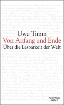 ‚Der legendäre ›Adorno-Hörsaal‹ VI der Frankfurter Goethe-Universität war überfüllt wie seit den Kampfzeiten nicht mehr, als Uwe Timm, der im Sommersemester 2009 die Poetikdozentur bekleidete, im fünfzigsten Jahr dieser Einrichtung, seinen Vorlesungszyklus eröffnete. Man saß auf Bänken und Pulten, alle Seitengänge und selbst die Zugänge waren verstopft. Zu hören waren in geballter Verdichtung fünf konzise poetologische Vorlesungen, die es in sich hatten und deren Vortragender seiner Aufgabe präzise, konzentriert und beherzt nachkam. Uwe Timm hatte dem Zyklus den Titel ›Von Anfang und Ende‹ gegeben und machte sich entlang aller wörtlichen wie metaphorischen Sinnebenen auf die Suche nach dem schon in den Melodien der Anfangssätze zu verankernden ›Urknall‹ literarischer Schöpfung, aus dem sprachliche Kunstwerke hervorquellen, die im gleichen Zug auch die Wirklichkeiten, unter denen Menschen leben, anschaulich erfassen. Zwischen den Anfängen und Enden spannte Timm einen Bogen vom biblischen Buch Genesis und der Offenbarung des Johannes über Goethe und Camus bis hin zu Adalbert Stifter, erörterte die Elemente poetischen Schreibens und begab sich auf einige atemberaubende Expeditionen ins eigene Romanwerk, das unter solchem Blick seine Offenheit bewies, auch für nachträgliche Konjekturen.‘ Volker Breidecker, Süddeutsche Zeitung