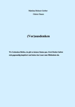 (Vor) ausdenken von Günter Baum, Martina Bohnet-Gerber Veröffentlicht am Montag 6. Mai 2013 von Books on DemandISBN: 978373222634448 SeitenGenre: Belletristik, Erzählende Literatur Teile dieses Buch auf: twitter facebook