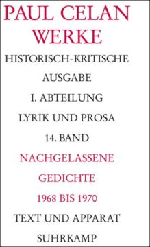 Band 14 der Bonner Celan-Ausgabe versammelt erstmals vollständig alle nachgelassenen Gedichte nach Schneepart (1968-1970). Ediert werden damit nicht nur die vier späten Gedichtsammlungen, an denen der Autor von August 1968 bis kurz vor seinem Tod im April 1970 gearbeitet hat, sondern auch alle vereinzelten Gedichte und Gedichtbruchstücke, wie sie sich verstreut vor allem in den Arbeitsheften dieses Zeitraums finden.