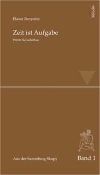 „Zeit ist Aufgabe“ – eine Auswahl aus „Sahadutha“ (aramäisch ‚Zeugnis‘, ‚Bezeugung‘), dem ersten, heute raren Aphorismenband, der 1969 in einer Auflage von 600 Exemplaren in Berlin herauskam. Dem in Jerusalem lebenden Verfasser zu seinem 77. Geburtstag überreicht von Hans-Horst Skupy, einem alten Verehrer und Freund. Elazar Benyoëtz nahm diese Gabe zum Anlaß, Worte Sahaduthas, die nicht im Buche stehen, aus allen Ecken und Enden seines Werkes zusammenzurufen. Sie erscheinen hier in dem Anhang „Das Heute ist von Ewigkeit, doch nicht von Heute“, gefolgt von einem aus Briefen montierten Nachwort des Autors mit dem Titel „Auf das Ende zu erschließt sich mir mein Ausgangspunkt“. Ausgewählte Textbeispiele: „Der Geist ist nicht aktiv, das ist seine Wirkung.“ / „Nicht Wollen, Gewillt-Sein ist das Stadium der Reife.“ / Einen Gedanken kannst du in deiner Sprache ausdrücken, eine Idee nur in deinem Leben.“ / „Ich weiß es nicht besser, ich weiß es nur anders.“