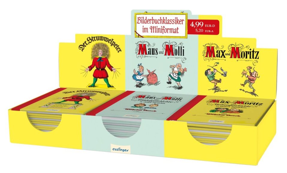 Display Mini-Bilderbücher Max und Moritz, Der Struwwelpeter, Maus und Molli