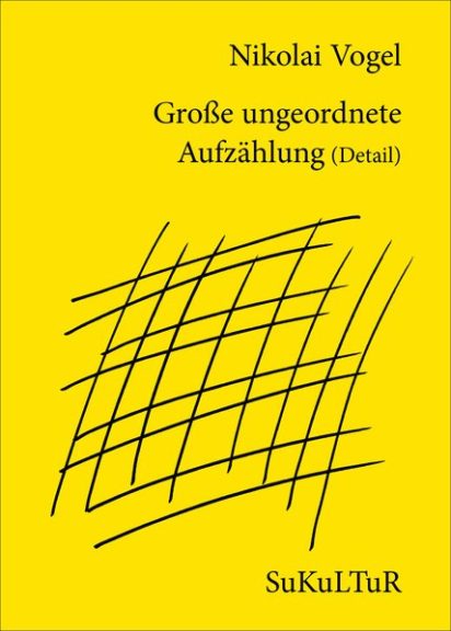Nikolai Vogel, geb. 1971 in München, lebt dort als Schriftsteller und bildender Künstler. Publikationen u.a.: »Spam Diamond«, Haymon 2012. »Große ungeordnete Aufzählung (Detail)«, Parasitenpresse 2009, SuKuLTuR 2014, und als Privatdruck bei Peter Ludewig 2008 und 2015. »Taubentext, Vogeltext«, mit Anja Golob, hochroth München 2018. »Fragmente zu einem Langgedicht«, gutleut verlag 2019.